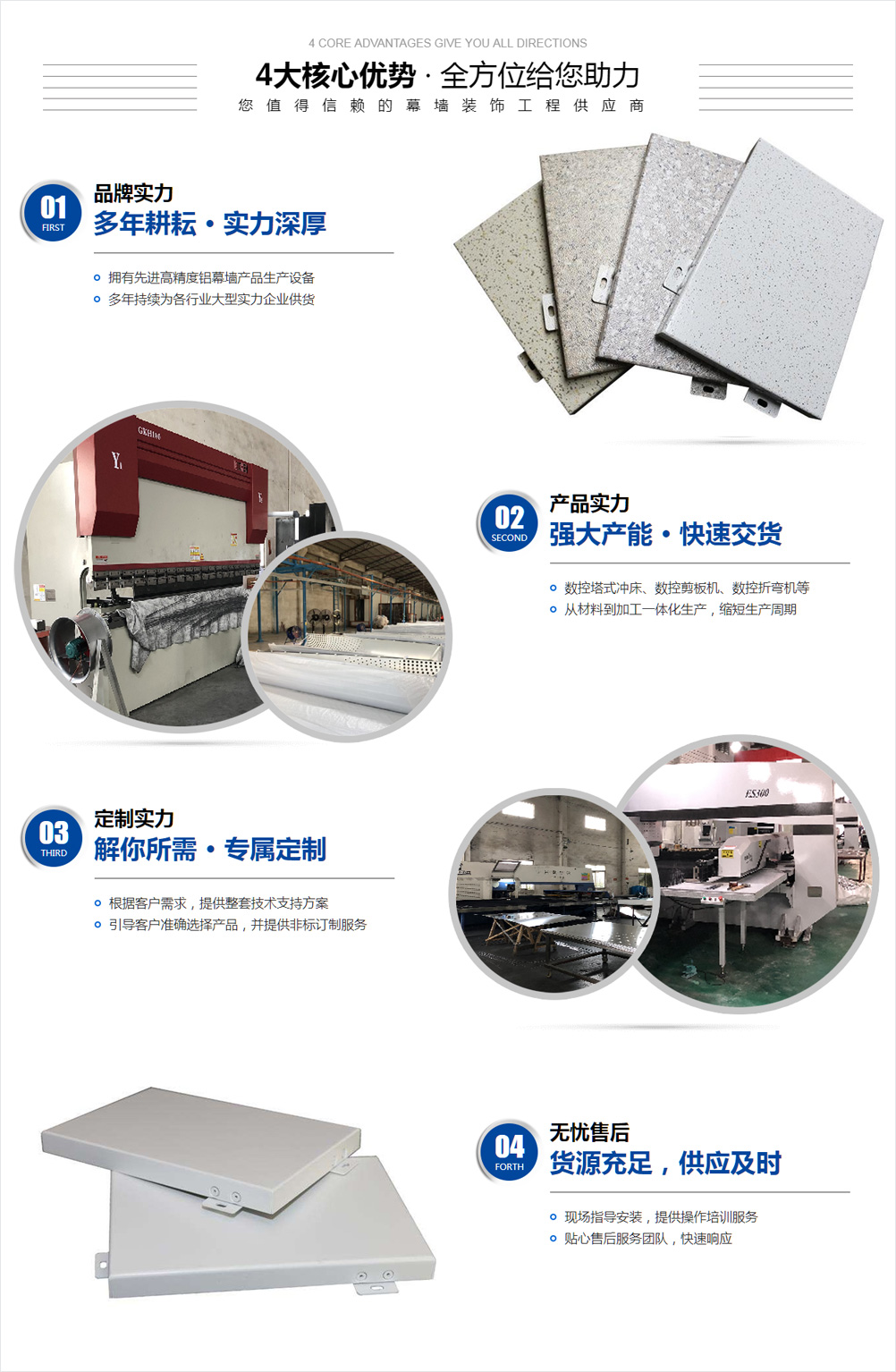 公司擁有先進高精度鋁幕墻產品生產設備、數控塔式沖床、數控剪板機、數控折彎機等以及進口自動氟碳噴涂設備..